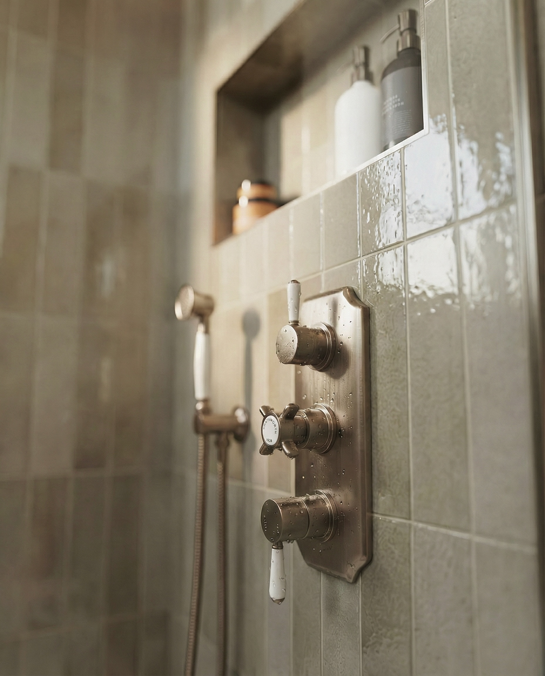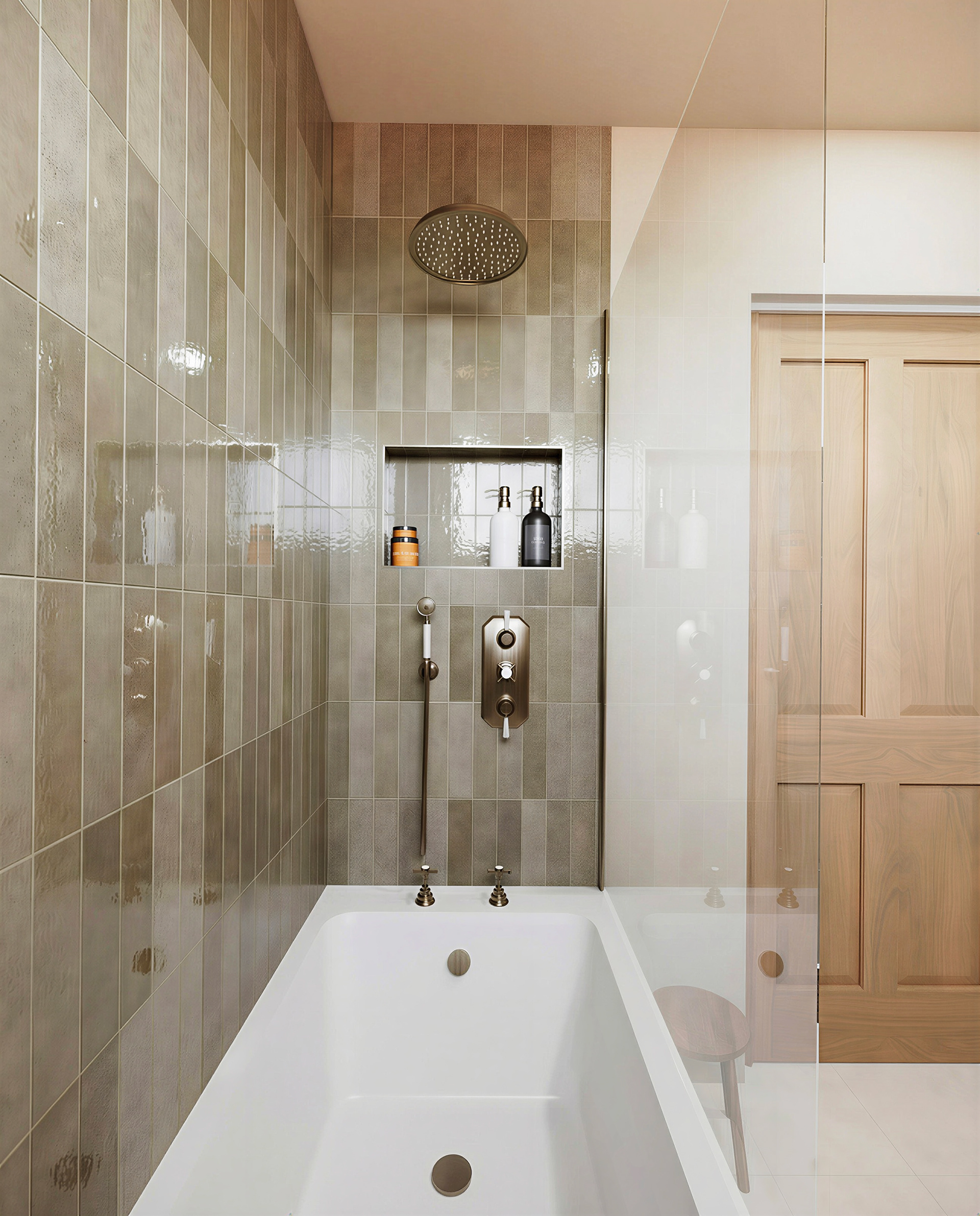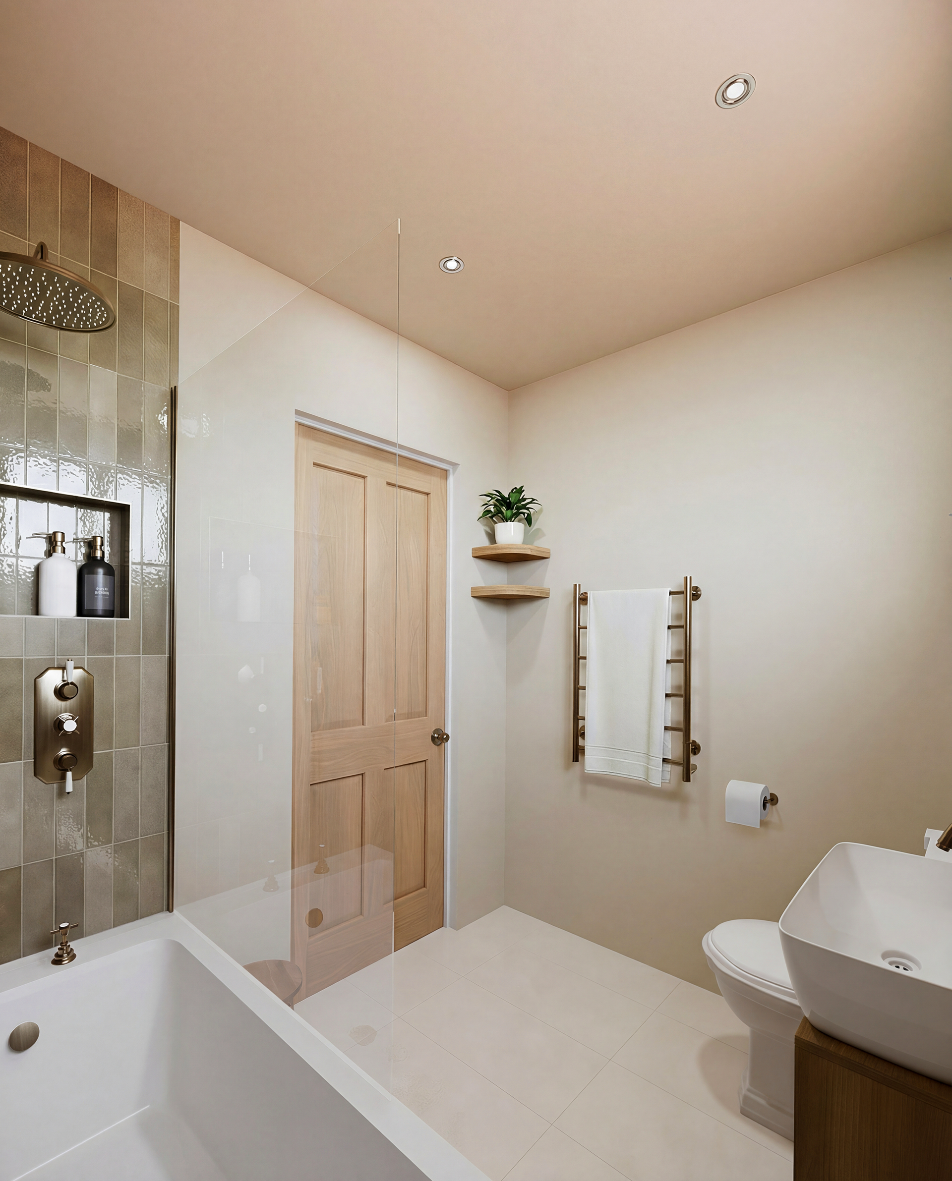 Warm minimalist bathroom CGI with natural textures, layered neutrals, and refined brass detailing.